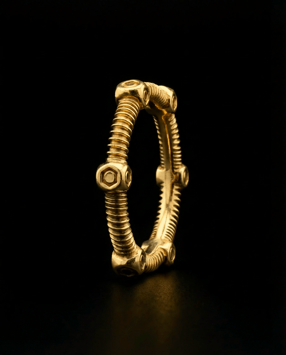 The FERRAMENTA sub-collection is hardware reimagined: the screws, nuts, and bolts of spinal surgical instrumentation translated into 18K gold. Ferramenta is Italian for 'hardware.' A single sculpted band.